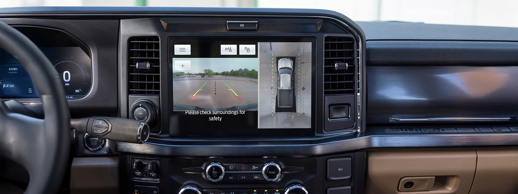 Simply press and hold the Pro Trailer Hitch Assist button and it takes over. It'll steer, accelerate, and brake for you while it guides your truck into place for easy hitching to your conventional trailer. This feature will allow you to stay put without having to hop in and out of the cab to see if your hitch is lining up.*
