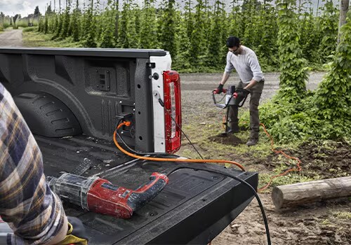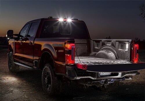 Available LED side-mirror spotlights and security approach lamps are included with the available PowerScope® Trailer Tow Mirrors. Plus, LED lighting in the truck bed allows you to keep working after dark.