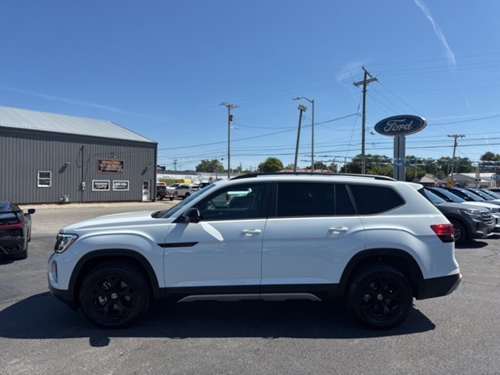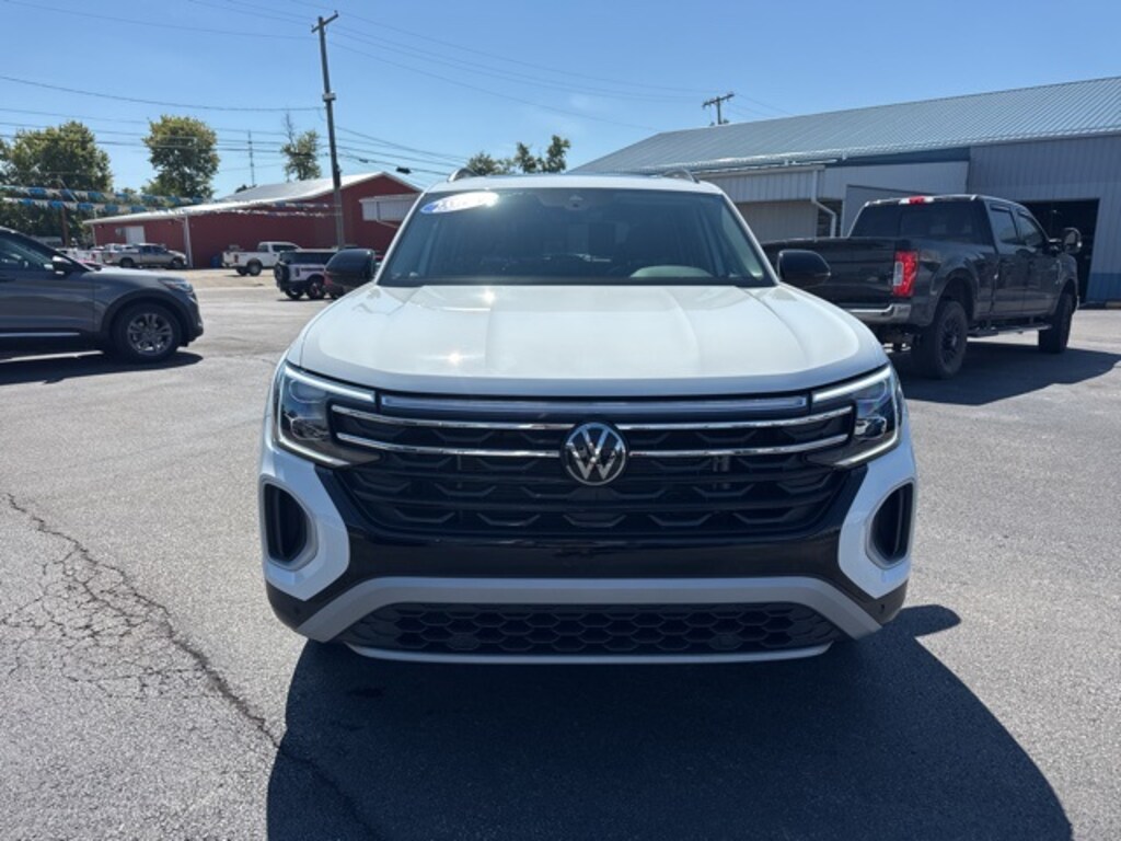 2025 White Volkswagen Atlas 2.0T Peak Edition 8-Speed Automatic 2.0L TSI AWD CARFAX One-Owner. Streaming Music, Diagnostic Alerts, USB Charging ports, Cruise Control, Backup Camera, 3rd Row Seats, Keyless Entry, Multi-zone Climate Control, Power Locks, Power Windows, Bluetooth, Hands-Free, Navigation, Portable Audio Connection, Premium Audio, Security System, Heated Seats, Leather Seats, Premium Wheels, Sunroof.