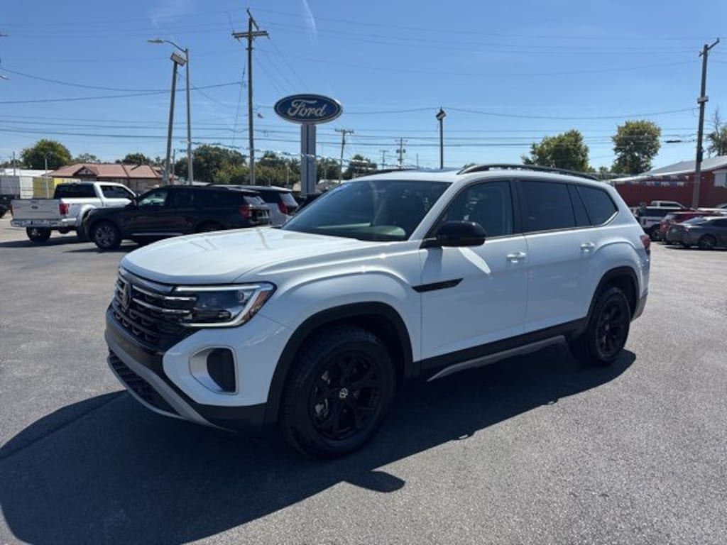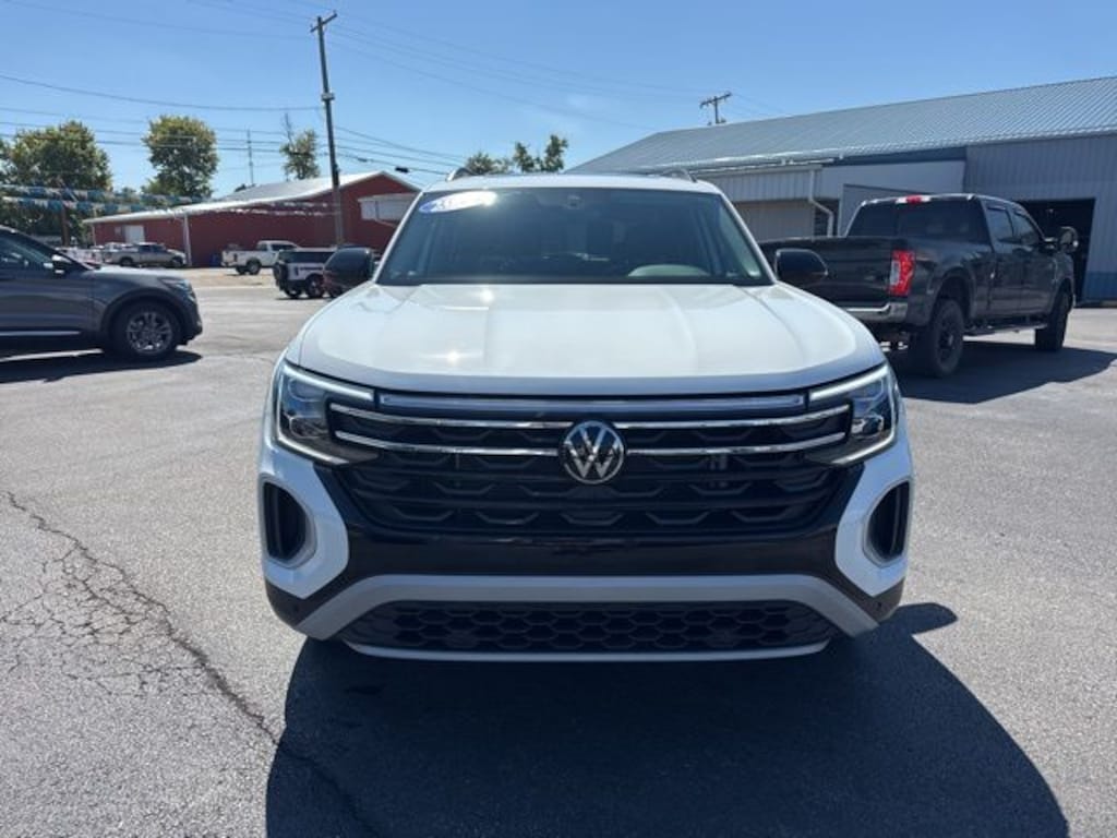 2025 White Volkswagen Atlas 2.0T Peak Edition 8-Speed Automatic 2.0L TSI AWD CARFAX One-Owner. Streaming Music, Diagnostic Alerts, USB Charging ports, Cruise Control, Backup Camera, 3rd Row Seats, Keyless Entry, Multi-zone Climate Control, Power Locks, Power Windows, Bluetooth, Hands-Free, Navigation, Portable Audio Connection, Premium Audio, Security System, Heated Seats, Leather Seats, Premium Wheels, Sunroof. Priced below KBB Fair Purchase Price!