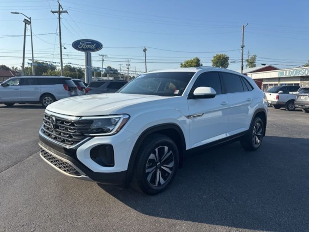 2025 White Volkswagen Atlas Cross Sport 2.0T SE 8-Speed Automatic with Tiptronic 2.0L TSI FWD CARFAX One-Owner. Clean CARFAX. Streaming Music, Diagnostic Alerts, USB Charging ports, Cruise Control, Backup Camera, Keyless Entry, Multi-zone Climate Control, Power Locks, Power Windows, Bluetooth, Hands-Free, Navigation, Portable Audio Connection, Premium Audio, Security System, Heated Seats, Leather Seats, Premium Wheels. Odometer is 1271 miles below market average! Priced below KBB Fair Purchase Price! 20/26 City/Highway MPG